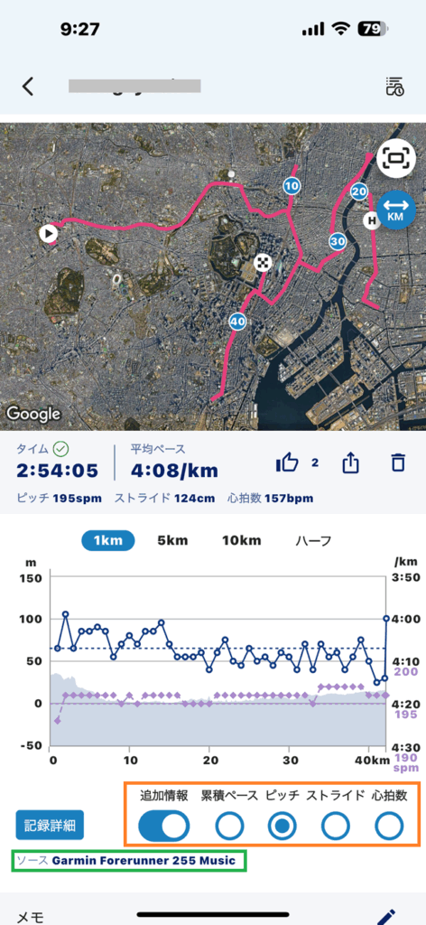 - これまでの「累積ペース」に加えて「ピッチ/ストライド/心拍数」を切替えて表示することが可能です。