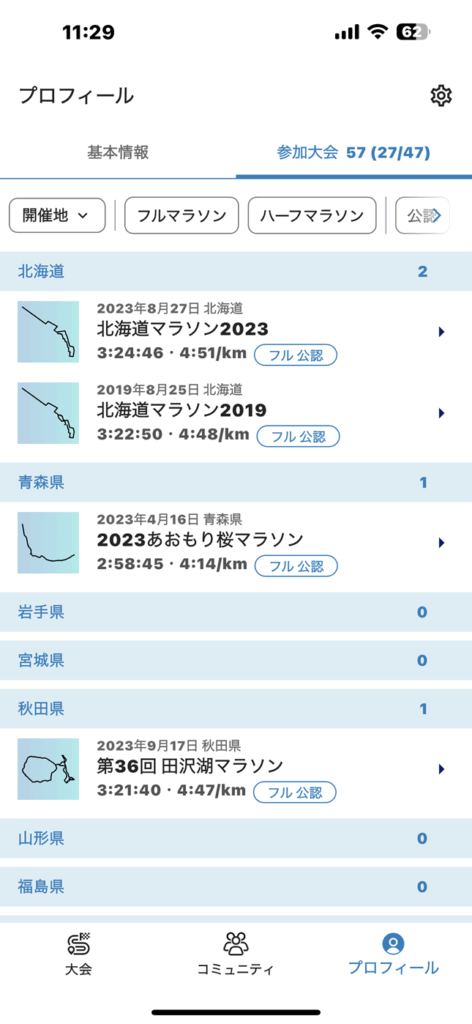 ソート“開催地”の時には、都道府県単位での参加数もタブ内に表示されます。「都道府県フルマラソン制覇」などを目指しているランナーには便利にお使い頂けると思います。