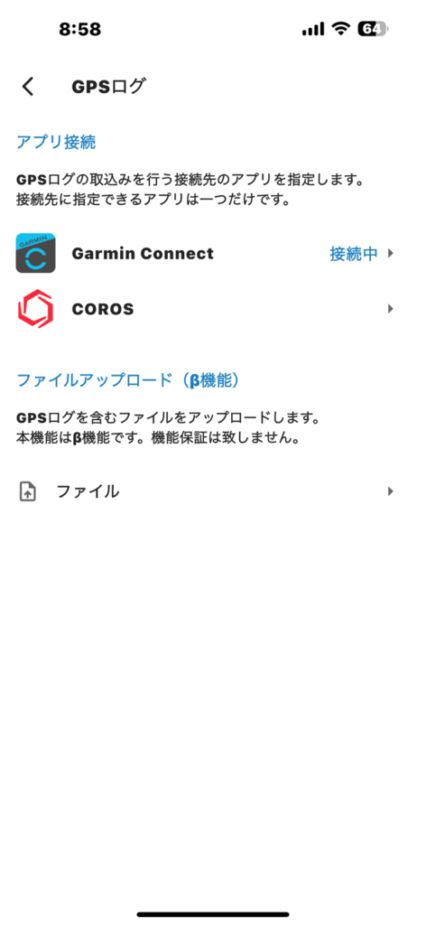 また、ユーザー登録は済ませたが [アプリ接続] 設定を行っていない場合、上記理由により、時間経過とともに遡り取込めるGPSログ対象が少なくなっていきますので速やかに設定をお済ませください。